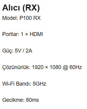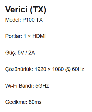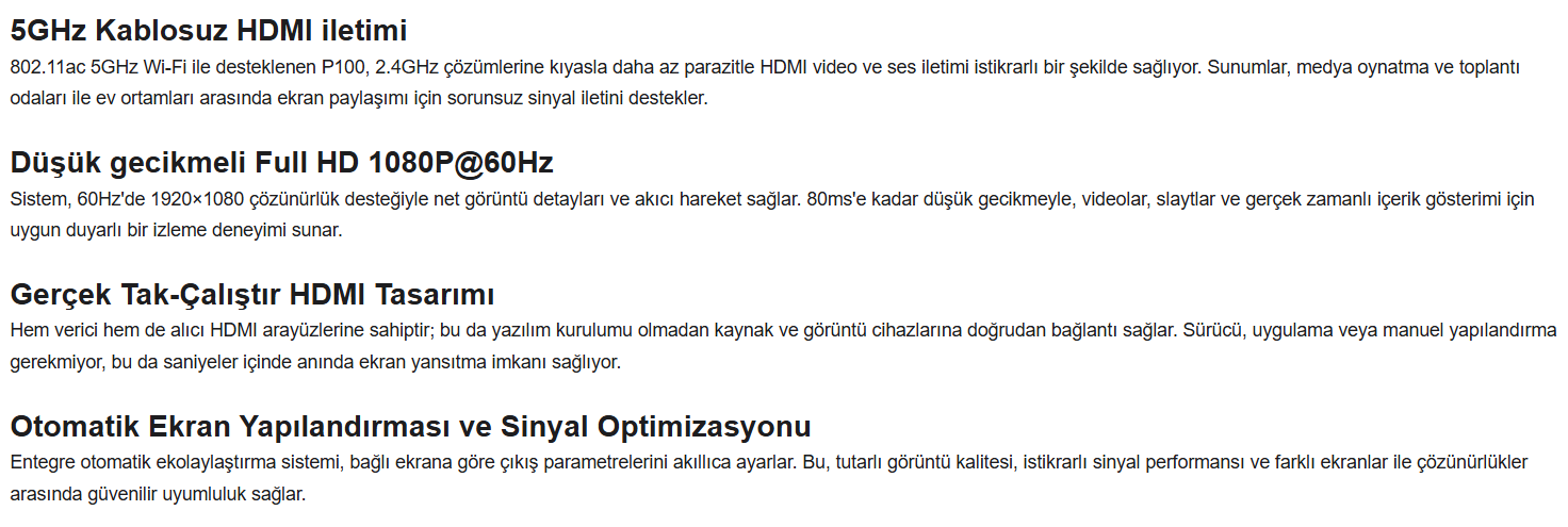 1. HDMI verici seti, Tak ve çalıştır. 2. HDMI Çıkışı, 1080P yüksek çözünürlük. 3. 5 GHz Wi-Fi ağ bağlantısı, internet köprüleme desteği. 4. WiFi üzerinden 50 metreye kadar uzun mesafeli video ve ses sinyali iletimi. 5. Alıcı çıkış portu: HDMI.