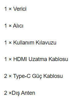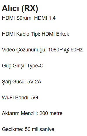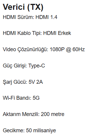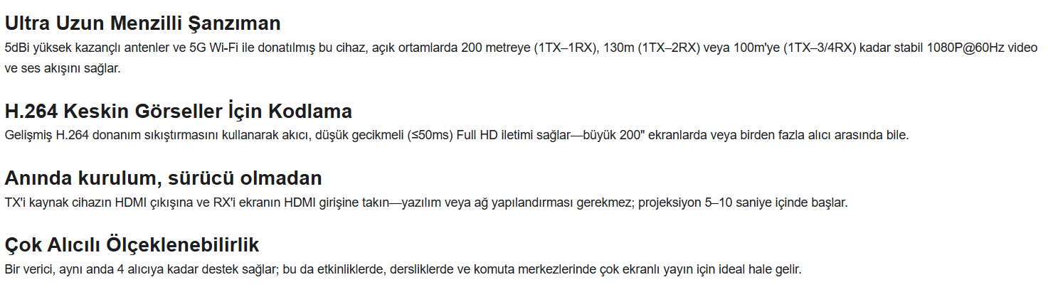 1. HDMI verici seti, Tak ve çalıştır. 2. HDMI Çıkışı, 1080P yüksek çözünürlük. 3. 5 GHz Wi-Fi ağ bağlantısı, internet köprüleme desteği. 4. WiFi üzerinden 50 metreye kadar uzun mesafeli video ve ses sinyali iletimi. 5. Alıcı çıkış portu: HDMI. 6. 1Tx ila 4 RX'e kadar destekler. 7. Tek alıcı ile 200 metre / 4 Alıcı ile 100 metre menzil.