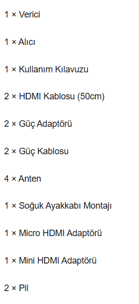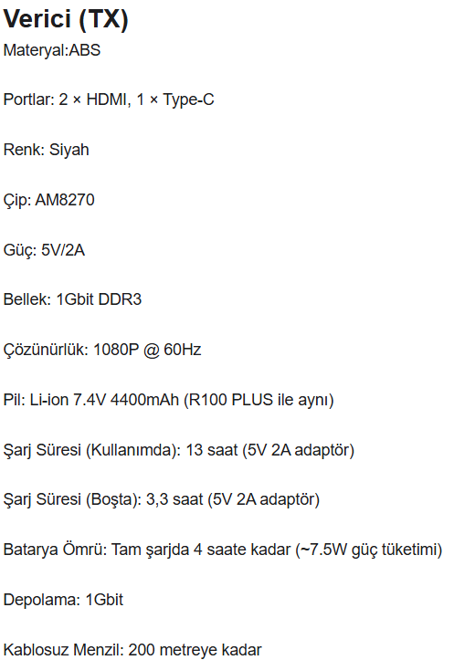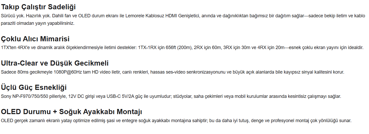 1. Pil ile kablosuz video iletimi, tak ve çalıştır. 2. HDMI çıkışı, 1080P yüksek çözünürlük. 3. 5 GHz Wi-Fi ağ bağlantısı. 4. Vericide bir HDMI girişi ve döngü çıkışı vardır. 4. WiFi üzerinden 200 metreye kadar uzun mesafeli video ve ses sinyali iletimi. 5. Alıcıda cihaz durumunu gösteren bir OLED ekran vardır ve çıkış bağlantı noktası HDMI'dır. 6. 1Tx ila 4 RX'e kadar destekler.
