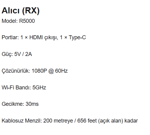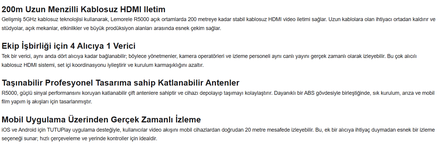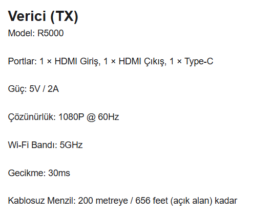 1. Tak ve çalıştır, kablosuz video iletimi. 2. HDMI çıkışı, 1080P yüksek çözünürlük 3. 5 GHz Wi-Fi ağ bağlantısı. 4. Vericide bir HDMI girişi ve bir HDMI çıkışı vardır. 5. WiFi üzerinden 200 metreye kadar video ve ses sinyali iletimi. 6. 1Tx ila 4 RX'e kadar destekler. 7. Telefona kablosuz aktarım. (TuTuPlay Uygulaması ile)
